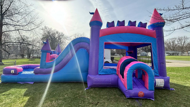 Brings a burst of royal fun to your event! — a colorful, all-in-one inflatable featuring a roomy bounce area, climb-and-slide, and splash-friendly landing. Designed for parties where variety and nonstop activity matter, this unit combines a spacious bounce house with protective mesh walls, a built-in climbing wall that leads to a tall slide, and a long slide run that empties into a shallow splash pool at the end. The vivid pinks, purples, and blues and castle-like turrets create a playful, princess-ready look that delights kids while keeping play contained and visible for easy supervision.