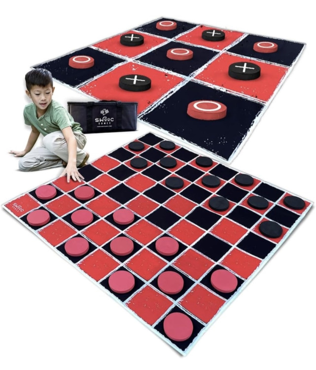 Giant Checkers: a portable, oversized checkers set that turns any backyard, classroom, or event space into a social, hands-on game zone. The set includes a large two-tone playing mat divided into playable squares and big, easy-to-grip round pieces in contrasting colors so players of all ages can see moves from across the yard. Lightweight and flexible, the mat rolls up and the pieces store in a carrying bag for quick setup, take-down, and transport. Ideal for birthday parties, family gatherings, school activities, or community events, this game encourages turn-taking, strategy, and friendly competition without complicated rules or fragile parts.
